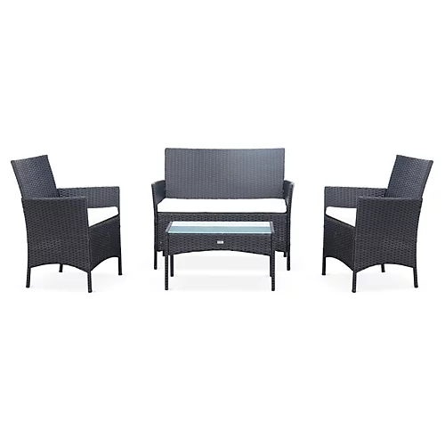 The Moltès garden set is suitable for small areas. It is trendy and space saving. Its affordable price and value are very appealing. It allows everyone to equip their terrace with a stylish and quality product. It can be integrated both indoors and outdoors. The Moltes is comfortable to sit on thanks to its 8 cm thick seat cushions. This set offers great comfort and can fit on small terraces or balconies. Polyrattan is a resistant synthetic material of fine quality. It was designed to withstand both sunlight (UV rays) and water damage (rain/snow/salt water). Its resemblance to natural rattan gives this material a chic and modern appearance making it perfect for both indoor and outdoor use. The entire metal frame is made from galvanised steel and has been coated in epoxy paint to prevent rust formation. We have carefully selected the best quality materials from our suppliers to weave our furniture offering you exceptional durability. The cushions are all water resistant with zipped covers for easy removal. The coffee table comes with a 5mm frosted tempered glass top (5x stronger than traditional glass). The set comes delivered in a self assembly. Rattan colour: BlackCushion colour: Off white1 x Sofa: W106 x D60 x H84cm (8.5kg)2 x Armchairs: W59.5 x D60 x H84cm (6.4kg)1 x Coffee table: W71 x D41 x H39cm (6.3kg)Height of the seat: 46cmFrame material: Galvanised steelMaterial: Woven polyrattan