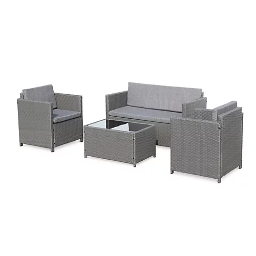 The Perugia is practical and modern. It is very solid and adapts to small terraces or balconies. The Perugia garden furniture set is ideal for those who wish to create a small lounge corner on their terrace. Stylish and resistant pollyrattan is a fashionable material. Its resemblance to natural wicker gives the Perugia model a modern and lounge look. This makes it suitable for both indoors and outdoors. The seats of the Perugia are very comfortable thanks to its thick cushions and 8 cm wide armrests.This Perugia set is made up of a pollyrattan sofa 2 chairs and a coffee table. It is designed to resist both sun ray’s (UV) and weather (rain/snow/salt water)For indoor or outdoor use Metal structure material: galvanised steel coated with epoxy pain (limit appearance of corrosion) Its armrests and backrests are both 5cm thick guaranteeing the utmost comfort. The cushions are all water resistant with zipped covers for easy removal. The coffee table is delivered with a tempered 5mm thick glass tray (5x more resistant than traditional glass) Dimensions: 1 x sofa: L118 x D55 x H68.5 / 12kg2 x armchairs: L61 x D55 x H68.5 / 7.3kg1 x coffee table: L71 x D45.5 x H38.5cm / 8.5kgFrame material: Galvanised steelMaterial: Woven polyrattan