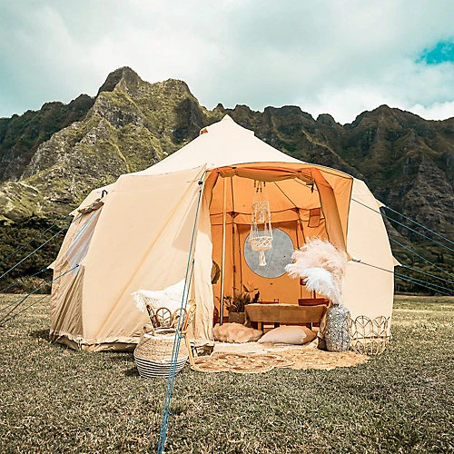 I am a Boutique take on the historically-loved Yurt Tent and am proud to be the renown ‘canvas-castle’ of the range – larger than life and designed meticulously with majestic grandeur and glamping-luxe in mind.