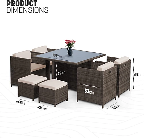 Designed for all-year-round outdoor use, this 9 Peice rattan garden furniture set is perfect for outdoor spaces, gardens, balconies, and entertaining areas. Whether you’re enjoying a cup of tea or hosting a dinner or a party, this garden furniture set provides ample seating and comfort for all your outdoor activities.