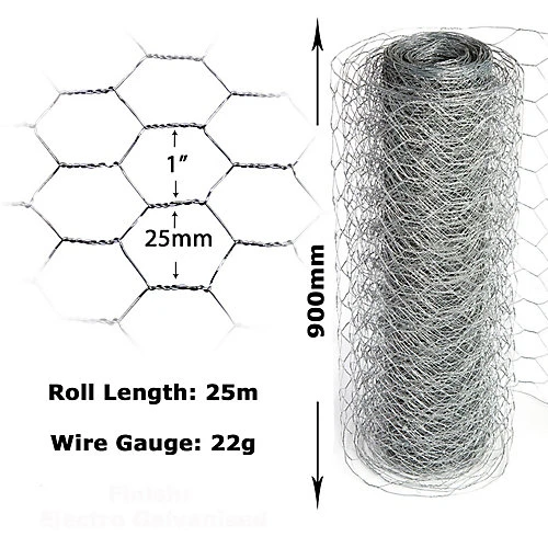 This offer is for a new roll of Chicken Wire in 25mm (1in) hole size and 25m length. Can be easily bent and cut to size 25mm wire 22 gauge (bwg) 25mm x 900mm x 25m (1in x 36in x 82 feet long). Many uses for this type of wire mesh, aviaries, chicken coops, rabbit hutches, fishpond cover, tree and shrub protection, fencing, concrete reinforcement, garden use etc. Can be easily bent and cut to size.