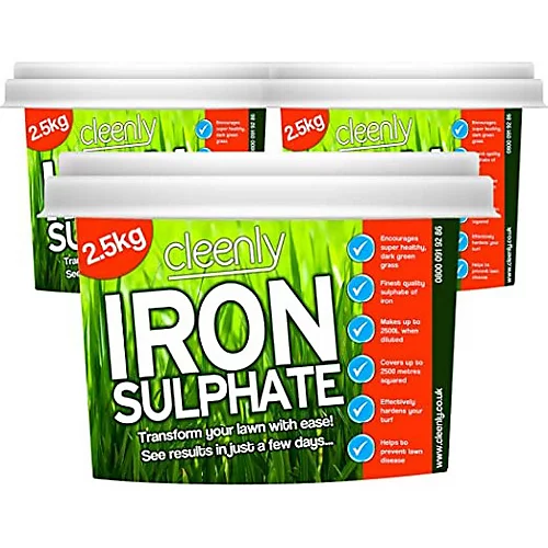 Grass Greening: Use 1-2g iron sulphate per 1L water. Use 1L of this solution per square metre of turf. Apply this solution to your lawn using a pump sprayer or watering can. Water down thoroughly using freshwater.