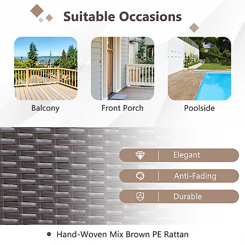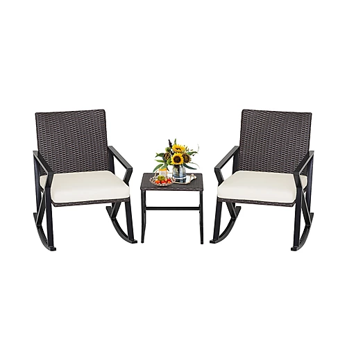 This 3-piece patio rocking chair table set will make you more comfortable and relaxed in leisure time. The ergonomic seat with soft cushion offers you endless comfort to sit. And you can rock back and forth with high stability and safety, as the rocking base is solid enough. What’s more, the coffee table is compact yet functional, allowing you to easily fetch the drinks or snacks. And it’s also of high stability with the additional PP board under the tabletop. The foot-pads of table are adjustable, making it stand more stably even on the ground which is not flat. Last but not least, both the rustproof metal frame and durable hand-woven PE rattan enable the whole set to accompany you for a long-lasting time.