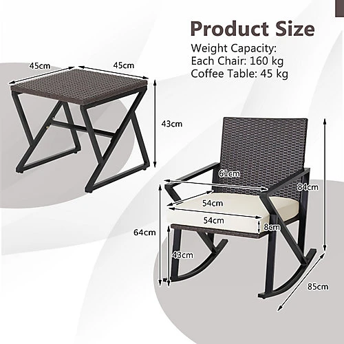 - Fetch Drinks Easier: This 3-piece rocking set also comes with a sturdy coffee table, which is perfect to place snacks, drinks, books, phones and so on for easy reach. Featuring a solid PP board under the tabletop, the table is of higher stability. And the adjustable foot-pads keep it more stable on the uneven ground.