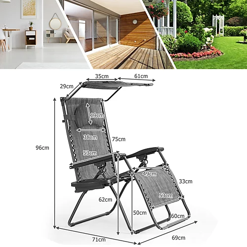 - Features: Made of quality powder-coated steel frame, durable and sturdy to stand up to 160 kg Smooth, lockable reclining system easily glides to ergonomic zero-gravity position Solid triangular support frame makes this zero-gravity chair reliable and durable Attached, adjustable canopy protects your face and eyes from the sunshine Strong bungee rope makes this patio gravity chair strong and resilient Non-slip footrest ensure good protection of your floor and it will be quiet Build-in headrest for adjusting from the top to waist, for better resting position A lightweight, folding design makes this chair easy to carry A removable side cup holder tray for convenient accessibility Replaceable elastic cords adjust to your body (extras not included) Ideal for garden, patio, deck, lawn, balcony, poolside, beach Specifications: Color: Grey Material: Steel+Fabric Dimensions: 92 x 74 x 112 cm (L x W x H) Net Weight: 9 kg Folding Size: 74 x 96 x 15cm (L x H x D) Maximum Weight: 160kg