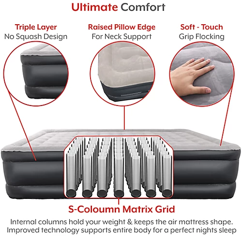 - Integrated raised pillow edge on all sides. The air bed is constructed with 40 structure air coils for extra lumbar and back support. We have designed the air bed so you can get a comfortable, good night’s sleep & is specially designed not to flip or sink if you sit on the edge of it.