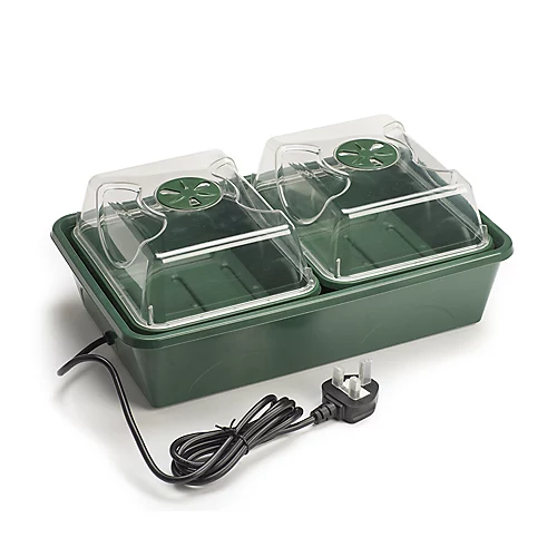 The EarlyGrow Heated 2-Bay Propagator is a compact unit with a 9 watt heater which increases soil temperature to +15°C of the ambient air temperature. Typically 16-21°C in the winter months which is ideal for most seeds to germinate. You can sow into the bays directly with compost and other growing mediums such as coir and rockwool or small pots. This propagator is made in the UK from shatterproof and UV resistant plastic.