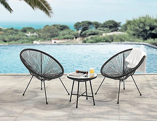- QUAINT DESIGN The Evre Goa Furniture Set gives that perfect holiday and poolside feeling that we’ve all been missing. Featuring two, super stylish, handwoven chairs and a quaint, glass topped coffee table – perfect for any size outdoor space. Sit back and relax in the cosy chairs that are interlaced with premium quality PE rattan that contours to your body shape for that optimal comfort feeling.