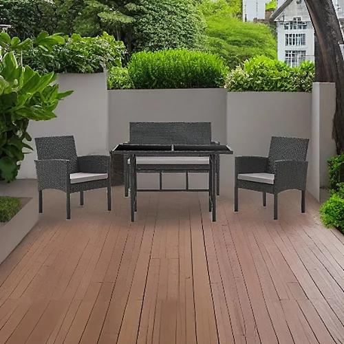Introducing the EVRE Porto Garden Lounge, the perfect seating set for up to four people. Whether you place it in your garden, conservatory, terrace, or even on your balcony, this versatile rattan furniture exudes luxury and style. Crafted with durable poly rattan wicker, it is weatherproof and easy to clean. The individually removable cushion covers with zippers add convenience. The set includes a glass-top table, two single chairs with cushions, and a double sofa with a cushion. To ensure its longevity, we recommend covering the furniture during bad weather and cleaning it with a damp cloth. Elevate your outdoor space with the EVRE Porto Garden Lounge, where comfort and sophistication meet.