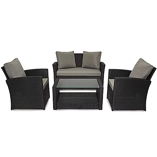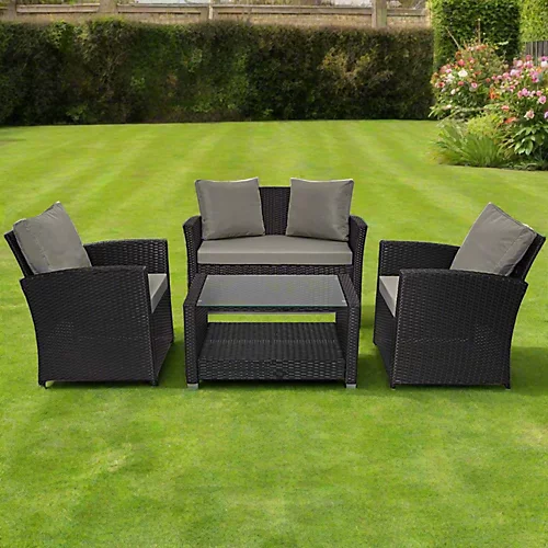 - LUXURY IN YOUR GARDEN High quality PE rattan surrounds and supports the frame complimented by the 6cm padded seat and back cushions. The coffee table has a supportive shelf along the bottom, ideal for storing your books and magazines. Along the top is a glossy and clear glass, tempered to withstand heat and ensures you don’t get hit with the glaring sun!