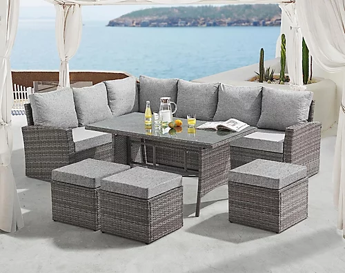 - Transform your outdoor space into a stylish and inviting haven with Marylin, the rattan garden dining set featuring a spacious corner sofa and 3 stools that accommodate up to 9 people, and 8-10cm thick luxurious cushions, making a soiree to remember!
