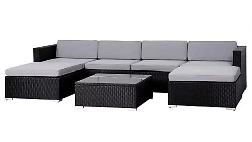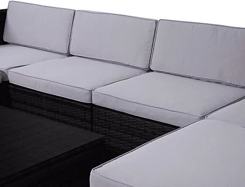 - PRODUCT DETAILS Set includes: 2 individual seats, 2 corner seats, 2 ottoman/footstool, 4 seat cushions, 4 back cushions, 2 ottoman cushions and a coffee table with glass. Furniture arrives flat pack in 4 separate boxes and will require assembly. This is very easy and a full instruction manual is provided with the purchase. The maximum weight allowance per seat is 110kg. Dimensions are approx in cm: Individual seat: 67x75x64 (LxWxH), corner seat: 75x75x64, ottoman: 75x75x75, coffee table: 75×75