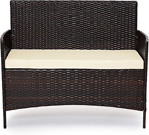 - PRODUCT DETAILS The set includes a two-seater bench, 2 single chairs, a coffee table and 3 seat cushions. Furniture arrives flat-pack in 1 box and will require assembly. This is very easy and a full instruction manual is provided with the purchase. The maximum weight allowance for each chair is up to 110kg and up to 200kg for the bench. Dimensions approx in cm: Two Seater Sofa 100x50x82 (HxWxD), chair: 47x47x82, coffee table: 66x40x38. Cushions are 100% polyester and about 5cm in thickness.