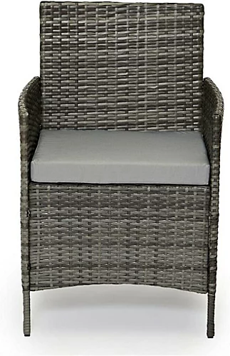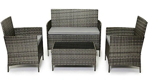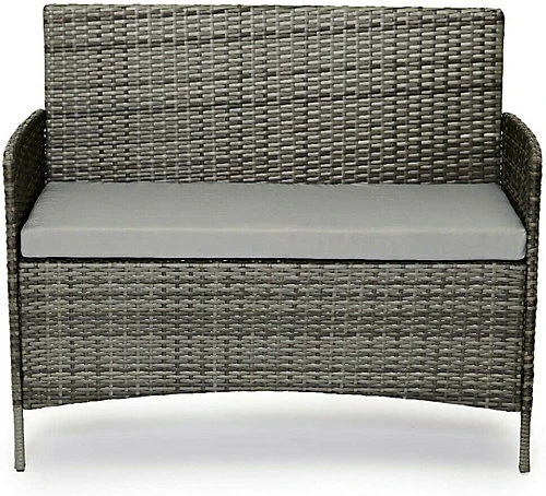 - PRODUCT DETAILS The set includes a two-seater bench, 2 single chairs, a coffee table and 3 seat cushions. Furniture arrives flat-pack in 1 box and will require assembly. This is very easy and a full instruction manual is provided with the purchase. The maximum weight allowance for each chair is up to 110kg and up to 200kg for the bench. Dimensions approx in cm: Two Seater Sofa 100x50x82 (HxWxD), chair: 47x47x82, coffee table: 66x40x38. Cushions are 100% polyester and about 5cm in thickness.