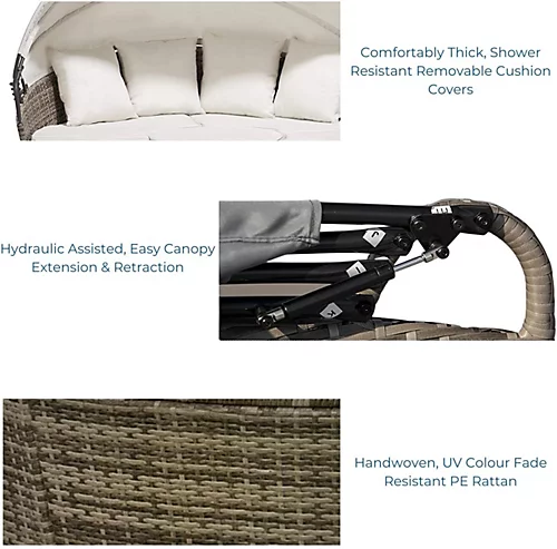 - Sun or shade? – A showerproof retractable canopy with assisted hydraulic lift allows you to easily block ultra violet rays and summer showers if caught out. On a warm day, simply tie the canopy back and make the most of lounging by converting the set in to a bed 2in1!