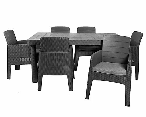 The Faro 6 Seater Deluxe Dining Set is perfect for entertaining friends and family in the sunshine. A stylish and compact design means this set is ideal for people with limited space. This modern, maintenance-free, hard-wearing polypropylene furniture set comes complete with 6 arm chairs and a rectangular dining table. The Faro 6 Seater Deluxe Dining Set is easy to assemble, and with its rattan weave effect, this set will complement any garden or outdoor living space.