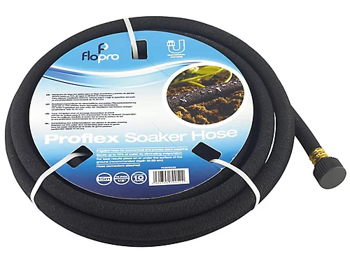 The Flopro Soaker Hose is an irrigation hose for economical and precise plant watering. It saves up to 70% of water by eliminating evaporation. For best results, the hose should be placed under the surface of the ground. Hose connectors are attached.
