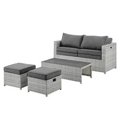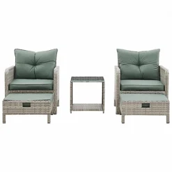 Grey Rattan Grey Cushions 6 Piece Garden Sofa Chairs Footstools Glass Top Coffee Table