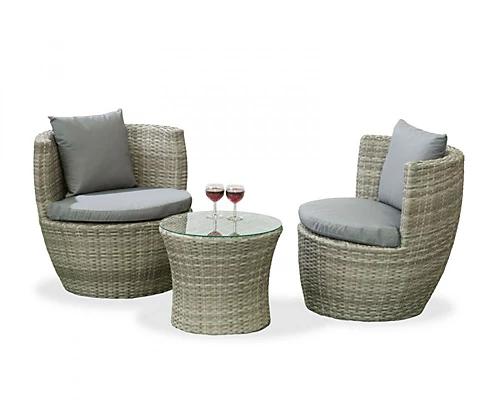 Our bottle shape bistro set is made from an all weather synthetic wicker & is ideal for patios and balconies thanks to its compact size