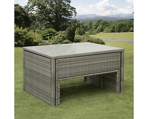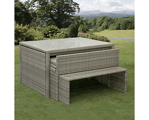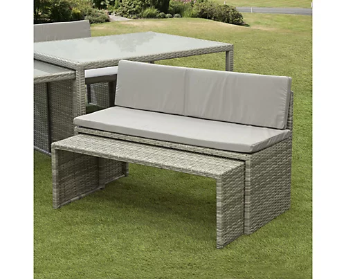 - This striking storage set offers great value for money and offers a distinct difference from the many PVC rattan garden sets available. Featuring Two Tables, 2 Benches and 2 Ottomans / smaller seating benches, the versatility and function of this set will meet any need!