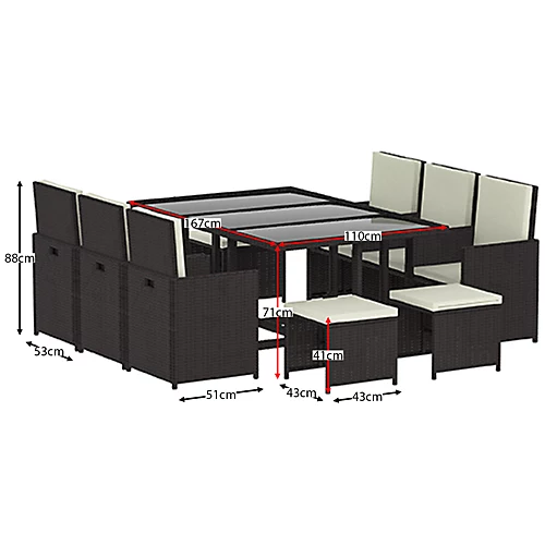 The Cuba 10 Seater Rattan Set is a modern and chic collection designed to transform traditional gardens into stylish and versatile spaces. The compact build of the 10 seater Cube makes it perfect for hosting parties and events, with extra surface or storage space available underneath and flat stools that can be used as additional seating or surfaces. But this set is not just practical it is also incredibly comfortable. With space for the whole family, the Cube integrates comfort and style, resulting in an elegant finish with a soft touch. The back and seat cushions included in the set add an extra layer of comfort and are also washable, making them easy to clean and maintain. Additionally, the set is made from fire retardant and UV resistant rattan material, making it both weatherproof and family-proof, ensuring that it will last for many years to come.