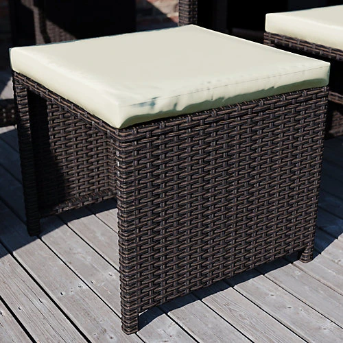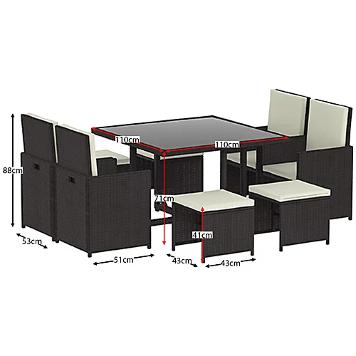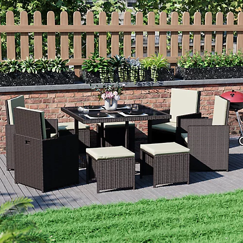 The Cuba 8 Seater Rattan Set is a modern and chic collection designed to transform traditional gardens into stylish and versatile spaces. The compact build of the 8 seater Cube makes it perfect for hosting parties and events, with extra surface or storage space available underneath and flat stools that can be used as additional seating or surfaces. But this set is not just practical, it is also incredibly comfortable. With space for the whole family, the Cube integrates comfort and style, resulting in an elegant finish with a soft touch. The back and seat cushions included in the set add an extra layer of comfort and are also washable, making them easy to clean and maintain. Additionally, the set is made from fire retardant and UV resistant rattan material, making it both weatherproof and familyproof, ensuring that it will last for many years to come.