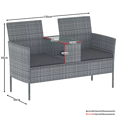 The Vienna Love Seat chair is the perfect addition to any romantic setting. This chair is designed with comfort and utility in mind, featuring a slot for food, drinks or a laptop. The rattan material used to make the chair is both fire retardant and UV resistant, ensuring durability and safety in any weather condition. The seat cushions are also washable, making it easy to clean up any spills or stains.