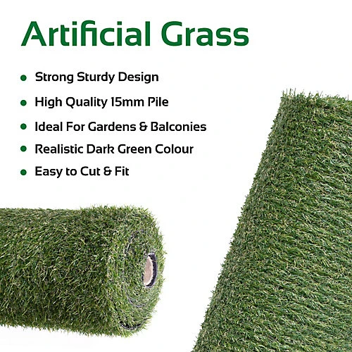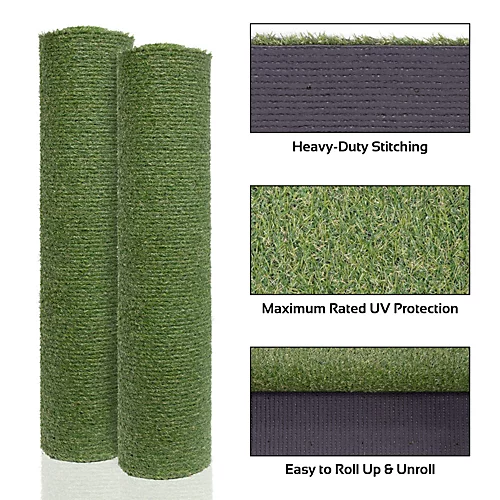 This game changing GardenKraft artificial grass is the perfect accessory for those who long for a perfectly manicured lawn without having the hassle of year-round maintenance. Each roll measures 4m x 1m and comes in a pile thickness of 15mm. The fake turf blends the colours of emerald green, lime green and bi-colour green to create a uniquely accurate depiction of real-life grass colourings. This truly is the best of both worlds for people who seek the real thing but don’t want the housekeeping responsibilities that come with keeping a neat lawn. The astro turf comes complete with a heavy-duty double stitching which strengthens the durability of the artificial grass. This means that there will be no need for weeding, watering, mowing, and the UV rating is set to Maximum Defence, preventing fading and discolouring for a 5 year period. Install this fake grass to simulate realistic grass texture and finishing’s to areas like children’s play areas, back gardens, office blocks, sports stores and clubhouses, outdoor dining areas and any other place you see fit.