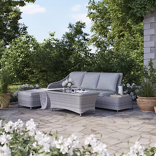 The elegant Hamilton furniture range features deep seating for maximum comfort. This space saving garden furniture set is perfect for bringing people together or for simply lounging in the sun. Its corner design creates an luxurious, stylish spot in your garden to relax on long summer days. The set is made of 8mm double half round wicker over a rust-free aluminium frame that is easy to maintain.