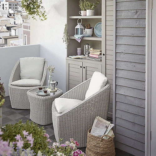 This Pilares 2 seater coffee set is Ideal for relaxing outside in smaller spaces such as balconies. Perfect for creating a tranquil space where you can enjoy a relaxing drink, the Pilares set combines contemporary shapes with a rustic woven texture. The small table offers an easy clean glass top, while the brilliant shape of the chairs makes for incredibly easy stacking and storing.