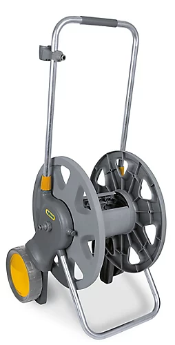 Hozelock’s largest capacity hose cart is extra tall to make towing easy, wide for stability and has been designed so that the hose is easy to rewind. The extra long soft touch towing handle, oversized soft patterned wheels and steel axle, make moving the cart simple. The towing handle locking collars allow the height to be adjusted to suit your needs, but also to fully retract the handle for easy storage. Designed with a wider stance and a lower centre of gravity for increased stability. Includes two hose connectors.