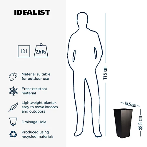 - UV & FROST RESISTANT tall tapered plant pot. The textured surface of this black planter from IDEALIST resembles concrete. Place it in the garden for stylish flower arrangements