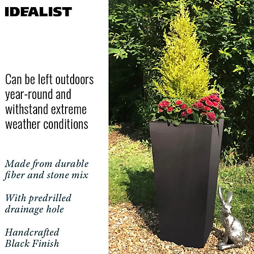 - UV & FROST RESISTANT tall tapered plant pot. The textured surface of this black planter from IDEALIST resembles concrete. Place it in the garden for stylish flower arrangements