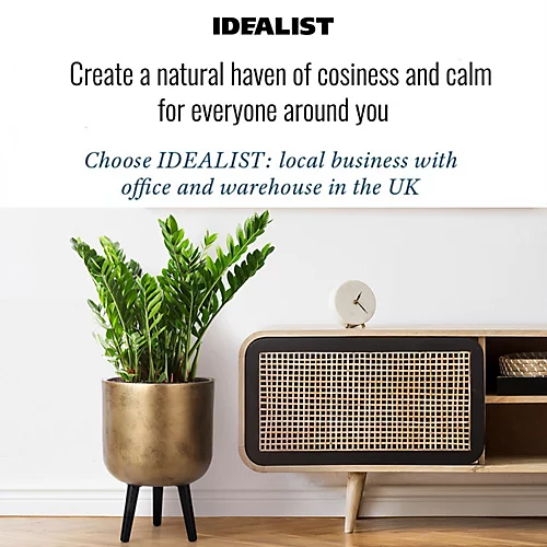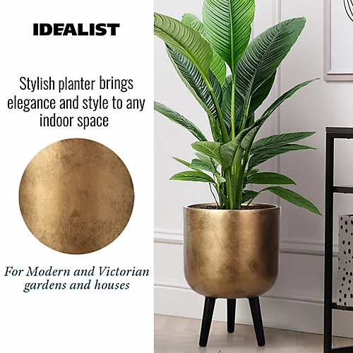 - UV RESISTANT round planter. This gold plant pot on legs has a natural surface with a concrete texture. No drainage hole supplied – intended for indoor use