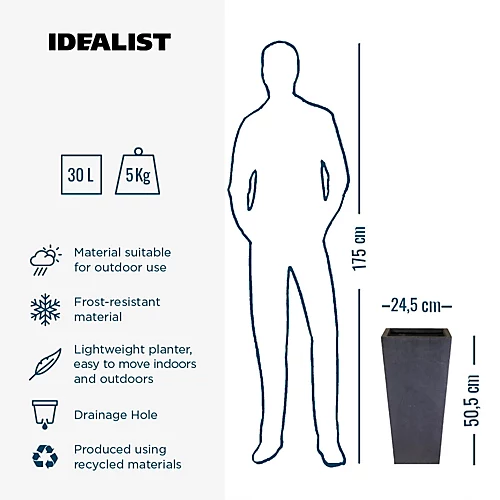 - UV & FROST RESISTANT tall tapered plant pot. The textured surface of this dark grey planter from IDEALIST resembles concrete. Place it in the garden for stylish flower arrangements