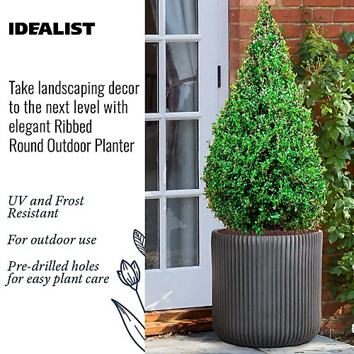 - UV & FROST RESISTANT round outdoor plant pots. This wonderful round plant pot has an elegant cylinder form and a ribbed surface. The black color adds this planter more modern look