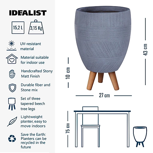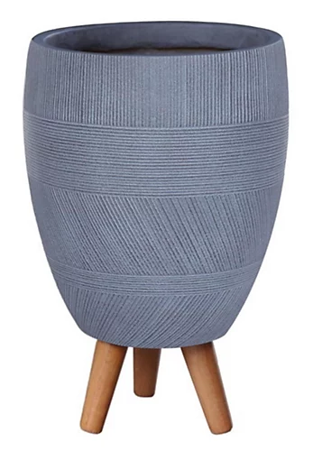 Add a pinch of style with this stone effect flower pot on sturdy wooden legs. Its clean shape and aesthetically pleasing pattern allow to spruce up any botanical corner effortlessly. Made from durable fiber and stone mix, the plunter is rather lightweight & low maintenance.