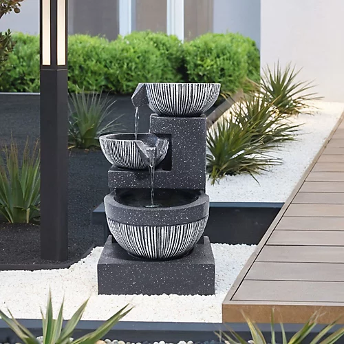 Equipped with solar panels, built-in LED lights, shining water flow with warm LED lights. The garden fountain has a solid structure, made of resin, with a natural stone appearance. Elegant design, close to nature. The water trickles down from each tier of the fountain creatingawonderful soothing sound and then recycles back into thefountainagain.