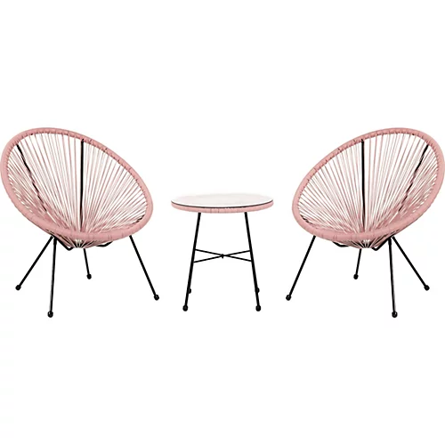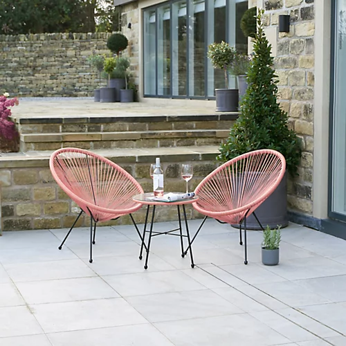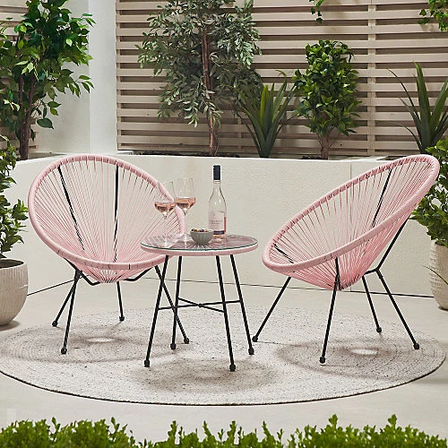 Sit in the sun with style on this beautifully designed bistro set. It includes a side table with two matching chairs. They are crafted from weatherproof, durable and UV protected soft, synthetic weave, with a powder-coated black steel frame for a high-quality finish. The table also includes high safety glass, which complies with British standards. Long-lasting and low maintenance, you will enjoy many sunny days relaxing in the garden on this comfortable outdoor bistro set. Single chair Dimensions: 72W x 83H x 81Dcm. Table Dimensions: 50W x 51H x 50Dcm. Set Area Dimensions approx. 200W x 84H x 180Dcm