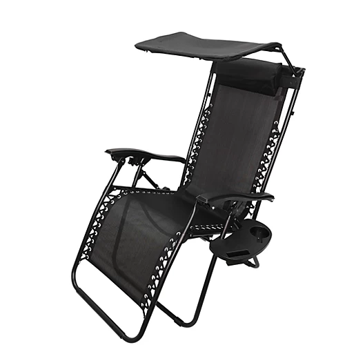 Lie back and relax in your garden this year with this multi position zero gravity chair. Perfect for the garden or patio this reclining chair lounger is made with a sturdy powder coated Black metal frame with a durable Black textoline fabric. The chair lounger features a removable pillow on the headrest for extra support and a canopy that is manoeuvrable. The design is operated by weight alone, simply take a seat and lie back as the back lowers your feet will raise and lift you into a comfortable reclining position and the natural movement of sitting up will prompt the chair to move with you. The chair also features a detachable cup holder tray that fixes onto the side. When not in use this chair is easily folded down to a compact size to be stored away. Max weight 120kg Fully reclined Dimensions H: 110cm L: 160cm W: 64cm Folded down H: 90cm L: 67cm W: 15cm
