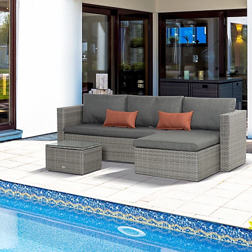 - THREE-PIECE RATTAN CHAISE SET: The rattan corner sofa comes with chaise lounge, a double-seat sofa and matching coffee table. The garden sofa set is great for corner spaces – or set up into different shapes to how you want. Great for gardens, patios and other outdoor areas.