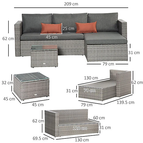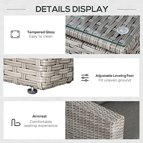This Outsunny outdoor corner sofa makes your garden just as inviting as the inside. Powder coated steel frames mean tough pieces, wrapped with plastic wicker for a rattan-ready look – in light grey for versatile style. Padded seat and back cushions of the small garden furniture keep you comfortable. Matching coffee table of the grey rattan sofa set with glass top for a solid handy holding place. An inviting conservatory furniture set for your garden.