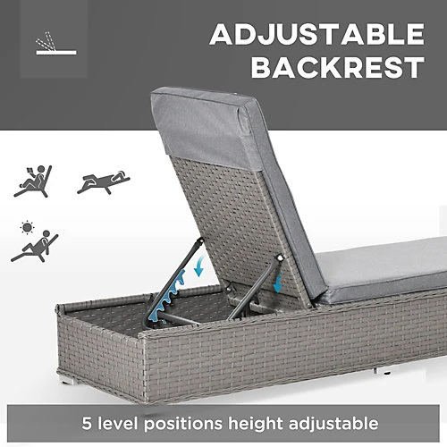 Make the summer days better than ever before with this three-piece rattan sun lounger set from Outsunny. Consisting of two loungers and a small matching side table. Adjustable to five different positions (going back as far as 180 degrees) for optimum comfort, each lounger is fitted with a grey padded cushion which covers the full length and width, with a head pillow to support you neck and head as you lean back underneath the warm and welcoming glare of the sun.