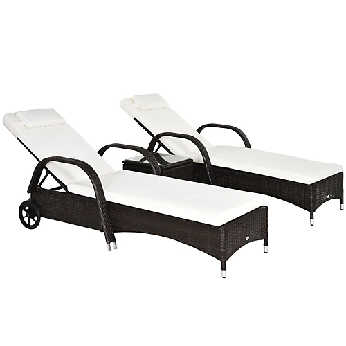 The rattan patio chaise lounge set from Outsunny comes complete with 2 loungers, 1 side table and cushions. The seat has 5 adjustable positions to give maximum relaxation and comfort. The side table also has a glass top to keep your drinks at easy reach, and the set can be used indoors and outdoors.