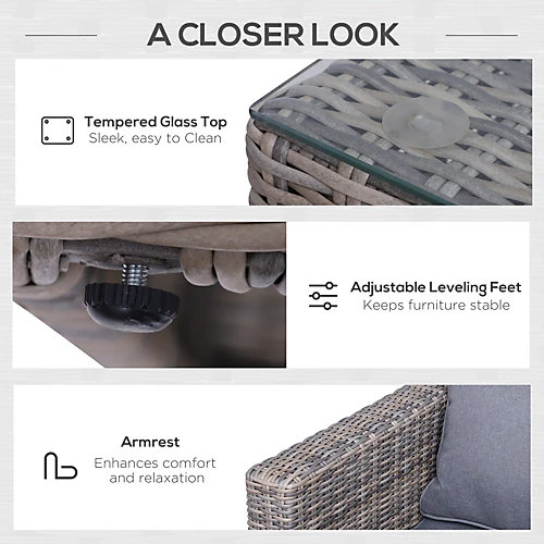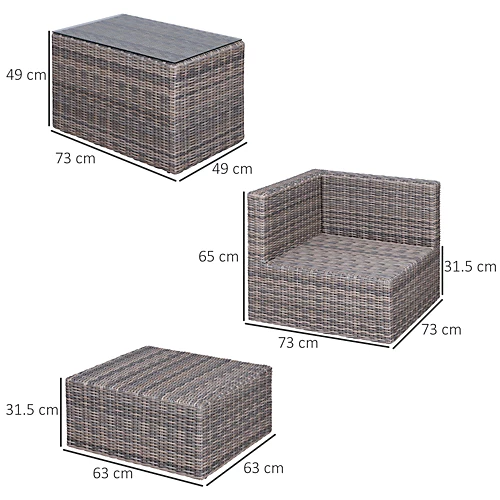 - • Item Name: rattan sofa set • Brand Name: Outsunny • Color: Mix Brown Rattan, Grey Cushion • Material: Aluminium, PE rattan, Vertical cotton, Polyester, Tempered glass • Max Load: (Sofa)160kg, (Table)75kg • Sofa Dimension: 73W x 73D x 65H cm • Stool Dimension: 63W x 63D x 31.5H cm • Table Dimension: 73L x 49W x 49H cm • Seat Dimension: 63W x 63D x 31.5H cm • Flat Pack: Yes • Custom Label: 860-088