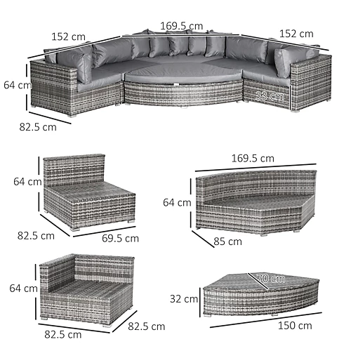 - • Color: Grey • Material: Metal, PE rattan, Polyester • Single Armrest Sofa Dimension: 82.5W x 82.5D x 64H cm • Armless Sofa Dimension: 169.5W x 85D x 64H cm • Footstool Dimension: 150W x 70D x 32H cm • Armless Middle Sofa Dimension: 69.5W x 82.5D x 64H cm • Seat Height(cushion not included): 33cm • Max Load: 160kg(per seat), 160kg(footstool) • Item Label: 860-132