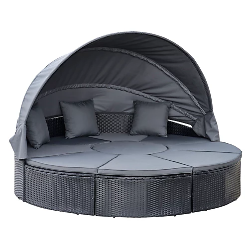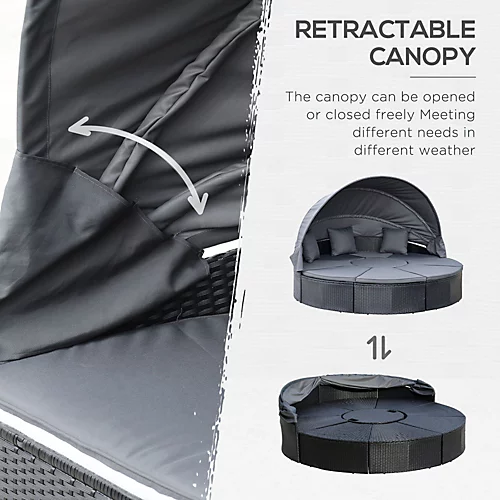 Want to add some new outdoor furniture to brighten your outdoor space? This 2-in-1 design 4 pieces PE rattan set from Outsunny will be your ideal choice to enjoy your leisure time together. You can use as a round daybed or sofa set according to your needs. The set features a metal frame wrapped with all-weather PE rattan wicker to serve you for a long time. Come with soft padded cushions and pillows to provide you extra comfort. Bring your quality outdoor life with Outsunny products.