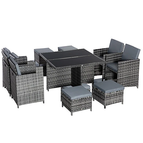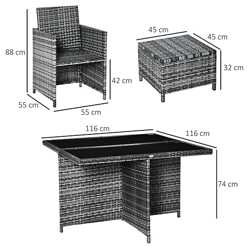 The Outsunny 9-piece rattan table and chairs with cushions are suitable for any occasion. The elegant rattan corner sofa dining set includes 1 table, 4 armchairs and 4 footrests made of aluminium frame and PE rattan. The wicker and tempered glass table combination of the rattan corner sofa dining set looks fashionable and create a modern style for your living area. The corner rattan dining set will complement various outdoor spaces for you.