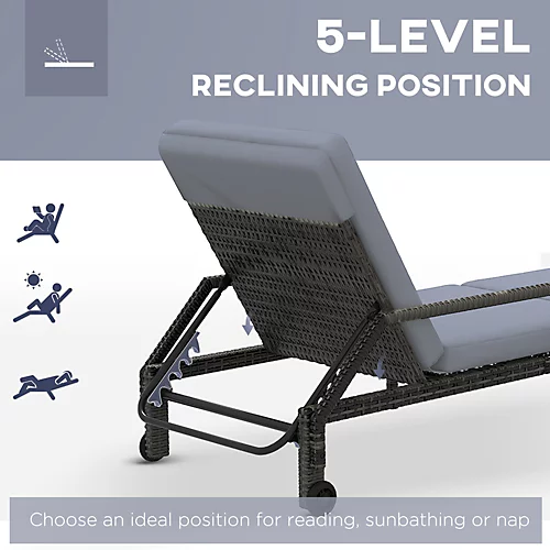 This outdoor rattan sun lounger from Outsunny is stylish and can fit with any backyard decor. Constructed by all hand woven PE rattan wicker and metal frame for durability. 5-level adjustable backrest, which can match your body provide relaxing and sleeping modes. With flexible wheels on both sides, the chaise chair can be easily moved from place to place as you like. Ensuring you will feel relaxed while sunbathing with our outdoor furniture.