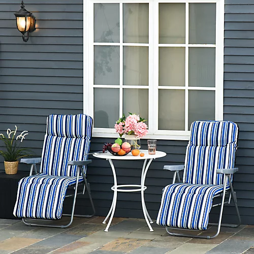 - • Colour: Blue and White • Material: Steel, Polyester, Cotton • Overall Dimension: 60W x 75D x 65-102H cm • Folded Dimension: 92L x 61.2W x 12H cm • Weight Capacity (each): 120kgs • Armrest from Floor: 63cm Item Label: 84B-571V70BU